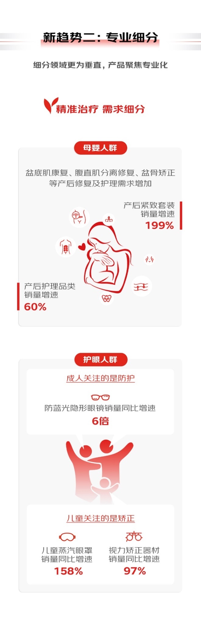 《報(bào)告》分析稱,當(dāng)下醫(yī)療器械在細(xì)分領(lǐng)域越發(fā)垂直,如母嬰人群的需求中,其中盆底肌康復(fù)、腹直肌分離修復(fù)、盆骨矯正等產(chǎn)后修復(fù)需求持續(xù)增長。2022年,產(chǎn)后緊致套裝銷量增速達(dá)199%,產(chǎn)后護(hù)理品類銷量增速達(dá)60%。