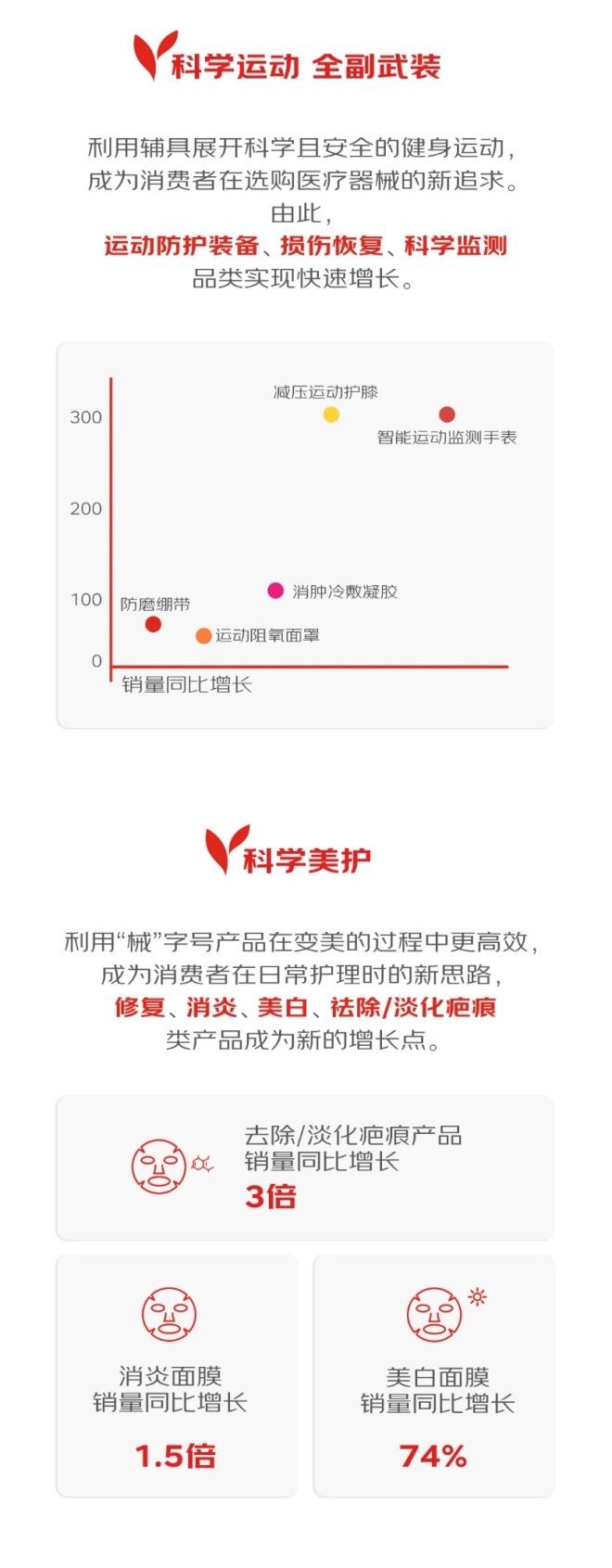 在運(yùn)動(dòng)人群的需求中,運(yùn)動(dòng)防護(hù)裝備、損傷恢復(fù)、科學(xué)監(jiān)測等細(xì)分的品類增速明顯,其中智能運(yùn)動(dòng)監(jiān)測手表、減壓運(yùn)動(dòng)護(hù)膝銷量同比增長3倍,消腫冷敷凝膠、防磨繃帶、運(yùn)動(dòng)阻氧面罩等產(chǎn)品銷量也快速增長。