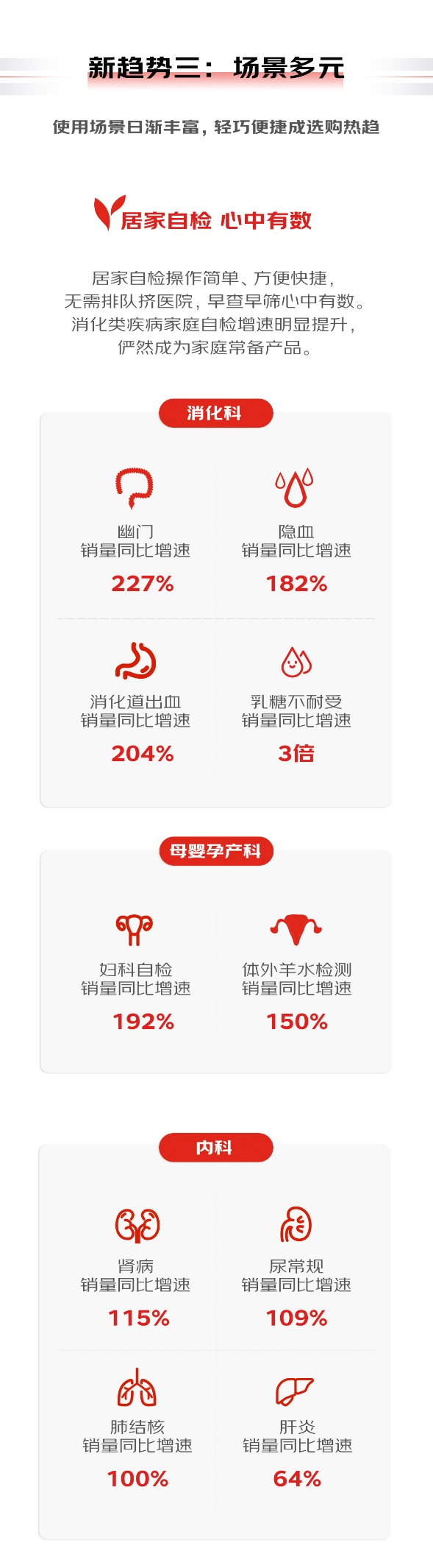 以居家場景為例,近年來居家自檢產(chǎn)品因其操作簡單、方便快捷的優(yōu)點(diǎn)快速發(fā)展。2022年,幽門桿菌、消化道出血、乳糖不耐受、孕產(chǎn)、婦科等自檢品類高速增長,乳糖不耐受自檢品類銷量同比增長3倍,幽門桿菌自檢品類銷量同比增速達(dá)227%。