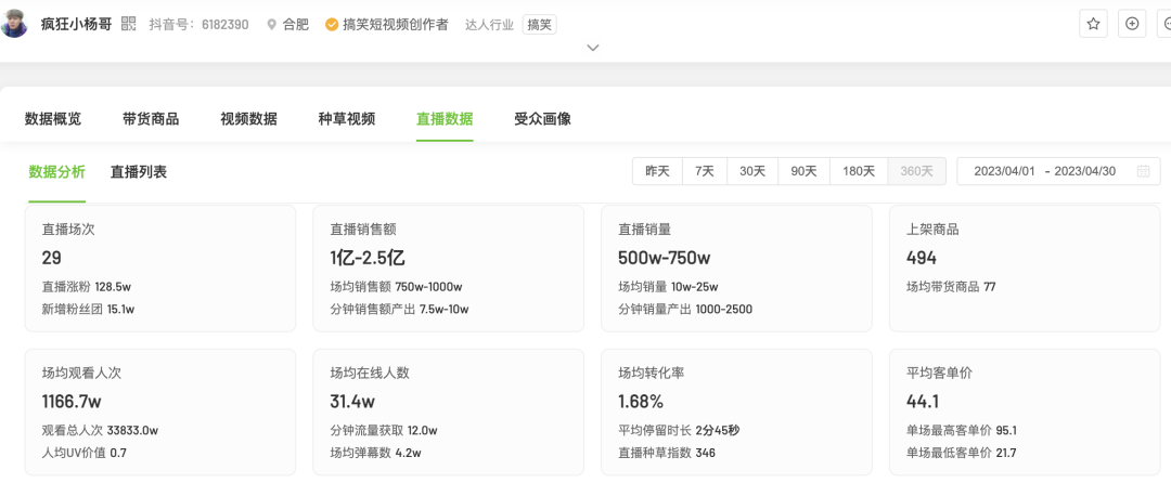 對(duì)于瘋狂小楊哥來(lái)說(shuō),盡管粉絲破億,但是在抖音中心化的流量分配機(jī)制下,小楊哥只有不斷花錢(qián)買(mǎi)量,才能維持行業(yè)關(guān)注度,其直播帶貨數(shù)據(jù)也隨之呈現(xiàn)不穩(wěn)定性。去年10月抖音的主播帶貨榜中,瘋狂小楊哥還以2.5億元-5億元的銷(xiāo)售額排名第二;但是剛剛過(guò)去的4月份,瘋狂小楊哥排名降至第七,直播間銷(xiāo)售額則降至1億元-2.5億元。