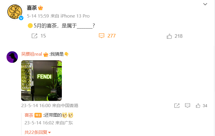 在其他社交平臺上,KOL們也在陸陸續(xù)續(xù)“透露”出這次喜茶的新聯名對象——FENDI。