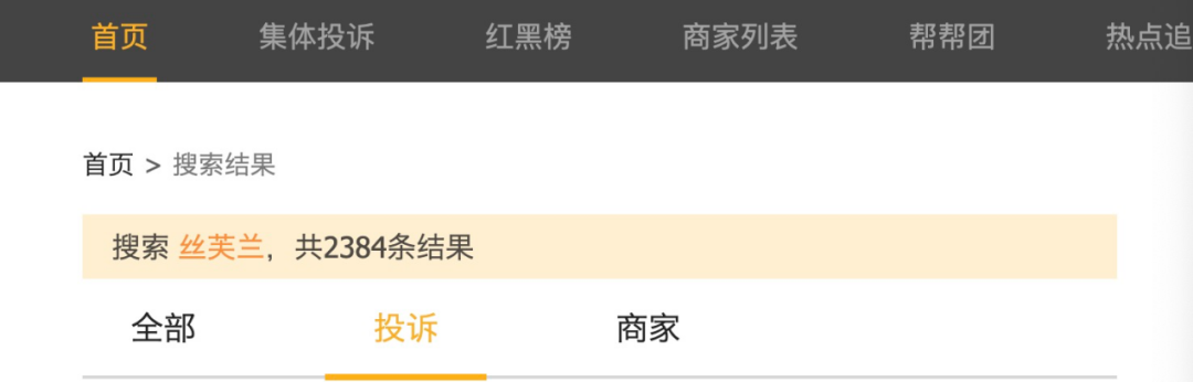 財經(jīng)無忌登陸“黑貓投訴”網(wǎng)站,以“絲芙蘭”為關(guān)鍵詞,共得到2384條投訴信息,絲芙蘭因存在退換貨難、發(fā)貨問題、售后服務(wù)、商品質(zhì)量等問題,引發(fā)消費者不滿。