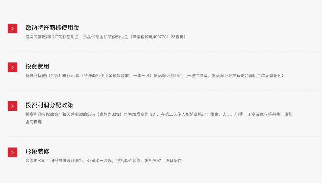 據(jù)當(dāng)前名創(chuàng)優(yōu)品官網(wǎng)顯示,加盟商投資需繳納特許商標(biāo)使用金、貨品保證金和裝修預(yù)付金。具體來(lái)看,特許商標(biāo)使用金為1.98萬(wàn)元/年(特許商標(biāo)使用金每年收取,一年一收),貨品保證金25萬(wàn)(一次性收取,貨品保證金在解除合同后全款無(wú)息返還),另外,門(mén)店租金、人工、電費(fèi)、工商及稅收等雜費(fèi),由加盟商自理。