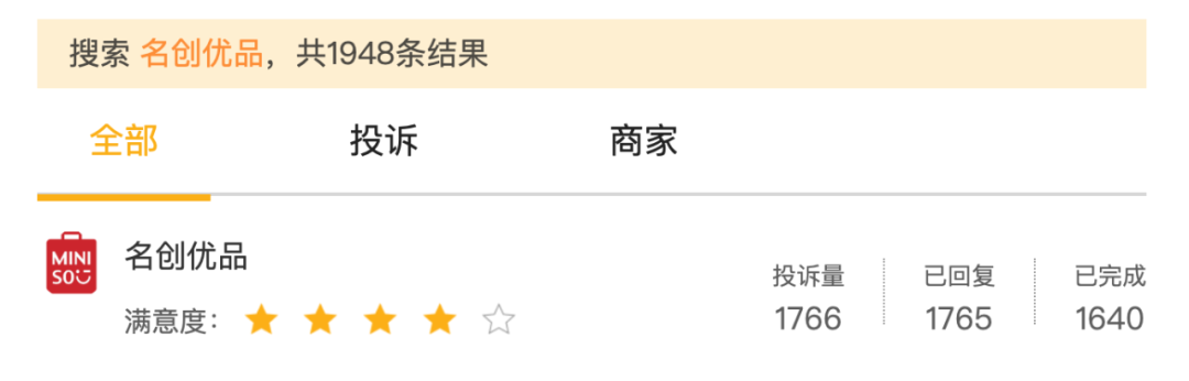 值得一提的是,在眾多投訴量中,名創(chuàng)優(yōu)品的“已回復(fù)”占比超99%,“已完成”占比93%,可以看出,名創(chuàng)優(yōu)品對(duì)網(wǎng)絡(luò)輿情還是相當(dāng)重視的,能夠及時(shí)關(guān)注網(wǎng)友的投訴并解決。但是在總投訴量上來(lái)看,數(shù)量上還是相當(dāng)較高的。同樣是在黑貓投訴平臺(tái),無(wú)印良品的投訴量不到800條,酷樂(lè)潮玩的投訴量300多條,都遠(yuǎn)低于名創(chuàng)優(yōu)品。