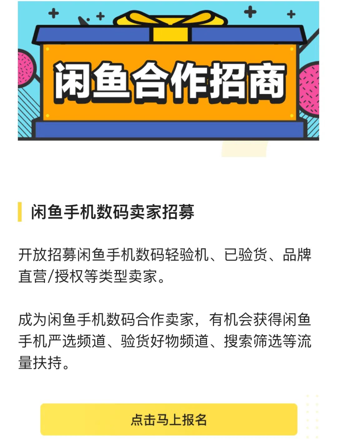去年,閑魚開通了合作招商渠道,即閑魚小鋪,其中線上招商招募有手機數(shù)碼賣家、卡券放心充賣家、二手車賣家、百幣奪寶獎品供應商四大類,每一類賣家成為閑魚合作賣家后,都將獲得不同程度的扶持,如成為閑魚手機數(shù)碼合作賣家后,就有機會獲得閑魚手機嚴選頻道、驗證好物頻道、搜索篩選等流量扶持。