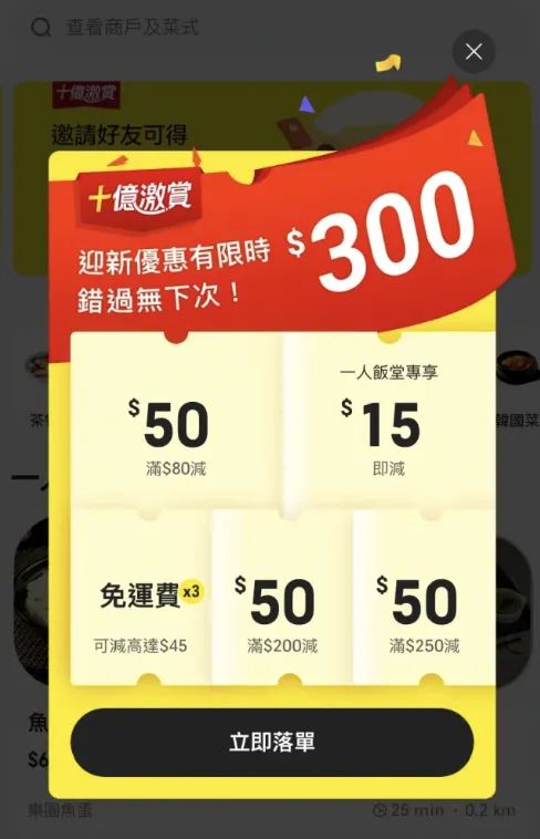 應(yīng)用端顯示,為了吸引香港地區(qū)的新用戶,KeeTa推出了10億港幣激賞計劃,每位新用戶注冊可以獲得價值300港幣的優(yōu)惠券,用于滿減和運費等。