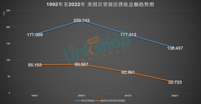 過去三十年,全美百貨公司行業(yè)每況愈下、再衰三竭。自1992至2022年,除折扣百貨外,全美百貨公司營收總額下跌了62%,從851.53億美元降至327.23億美元。過去十年,百貨公司的衰落更是按下了加速鍵,2012年除折扣百貨外的營銷總額為629.61億美元,現(xiàn)今更幾近腰斬。