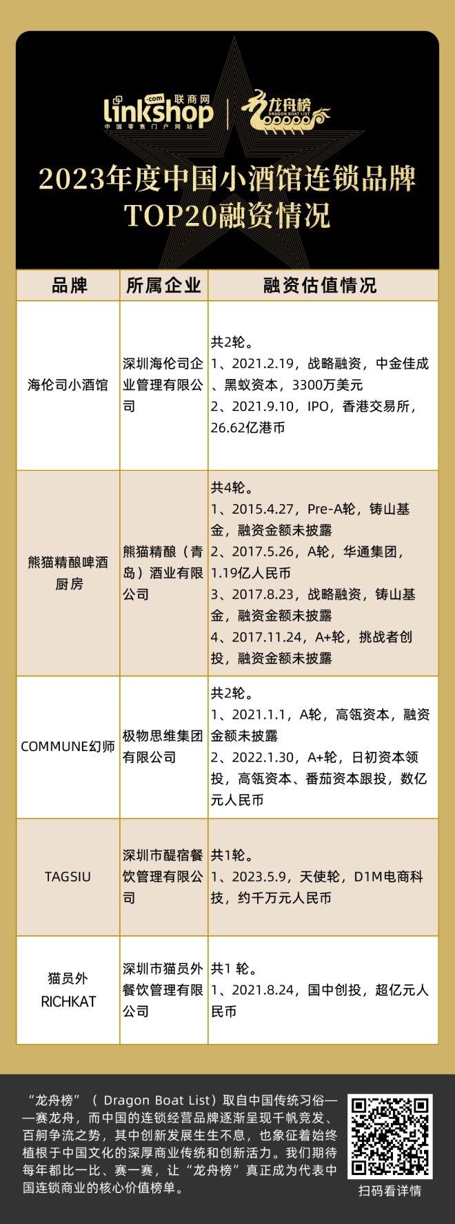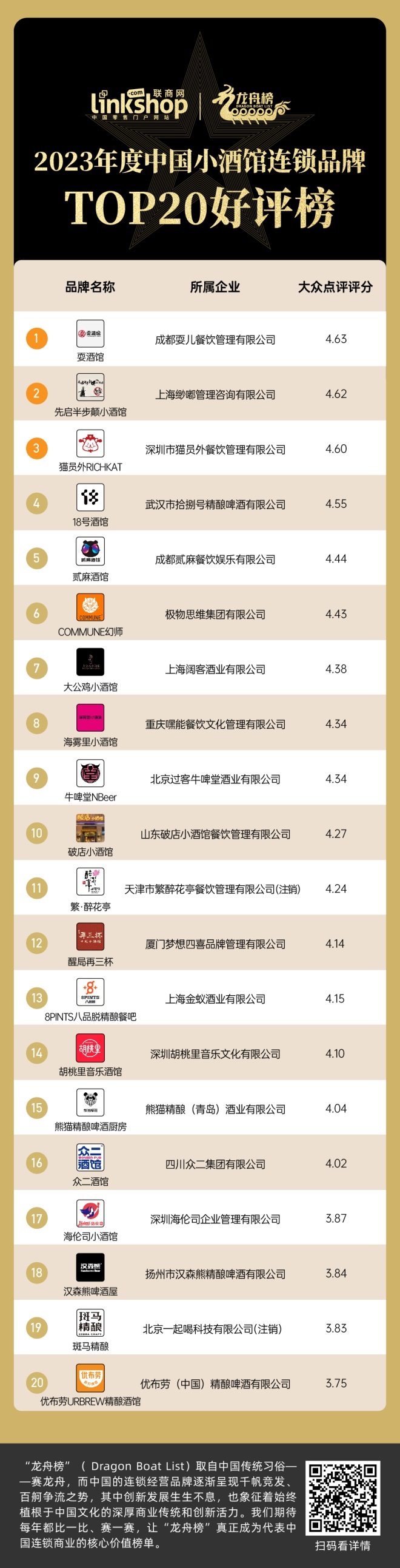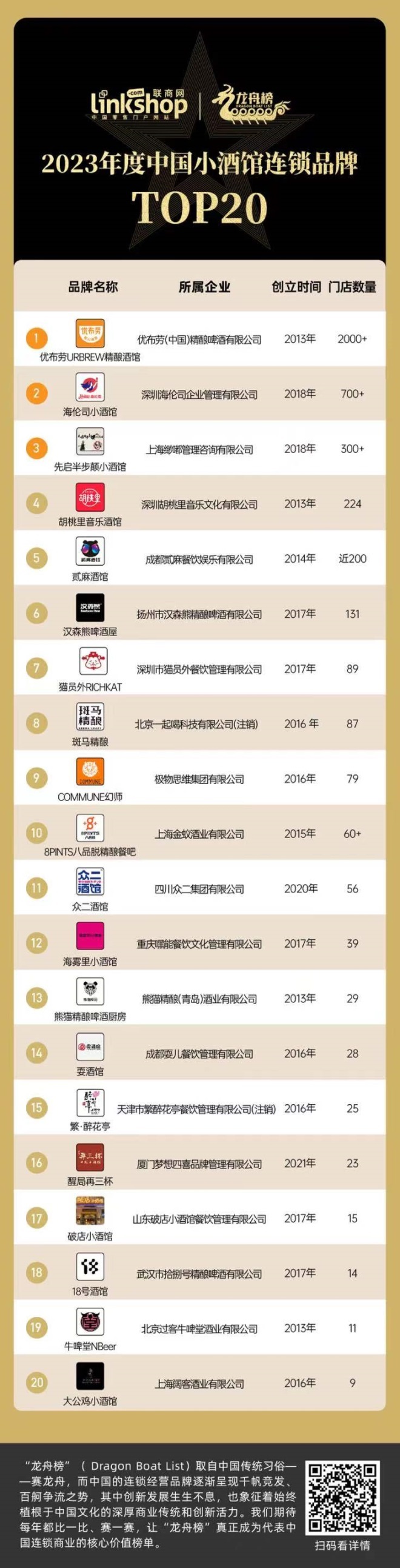 本期為全新聚焦的小酒館業(yè)態(tài),特別推出龍舟榜之“2023年度中國小酒館連鎖品牌TOP20”,從門店數(shù)據(jù)、消費(fèi)者滿意度、市場融資情況等維度窺視各大品牌的發(fā)展情況和經(jīng)營情況,以及小酒館行業(yè)呈現(xiàn)的發(fā)展特征及未來空間。