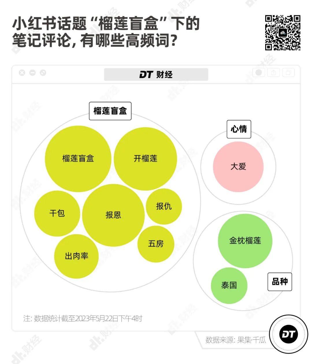截至2023年月5月22日,抖音話(huà)題 #徒手剝榴蓮的驚喜# 播放量達(dá)到5.4億,#又到了開(kāi)榴蓮盲盒的季節(jié)# 播放量達(dá)到4.3億。小紅書(shū)近一個(gè)月和“榴蓮盲盒”有關(guān)筆記達(dá)到1.17萬(wàn)篇。
