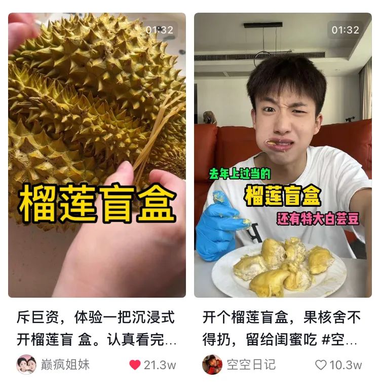 在抖音、小紅書(shū)、B站等平臺(tái)上,榴蓮盲盒視頻頗受歡迎。