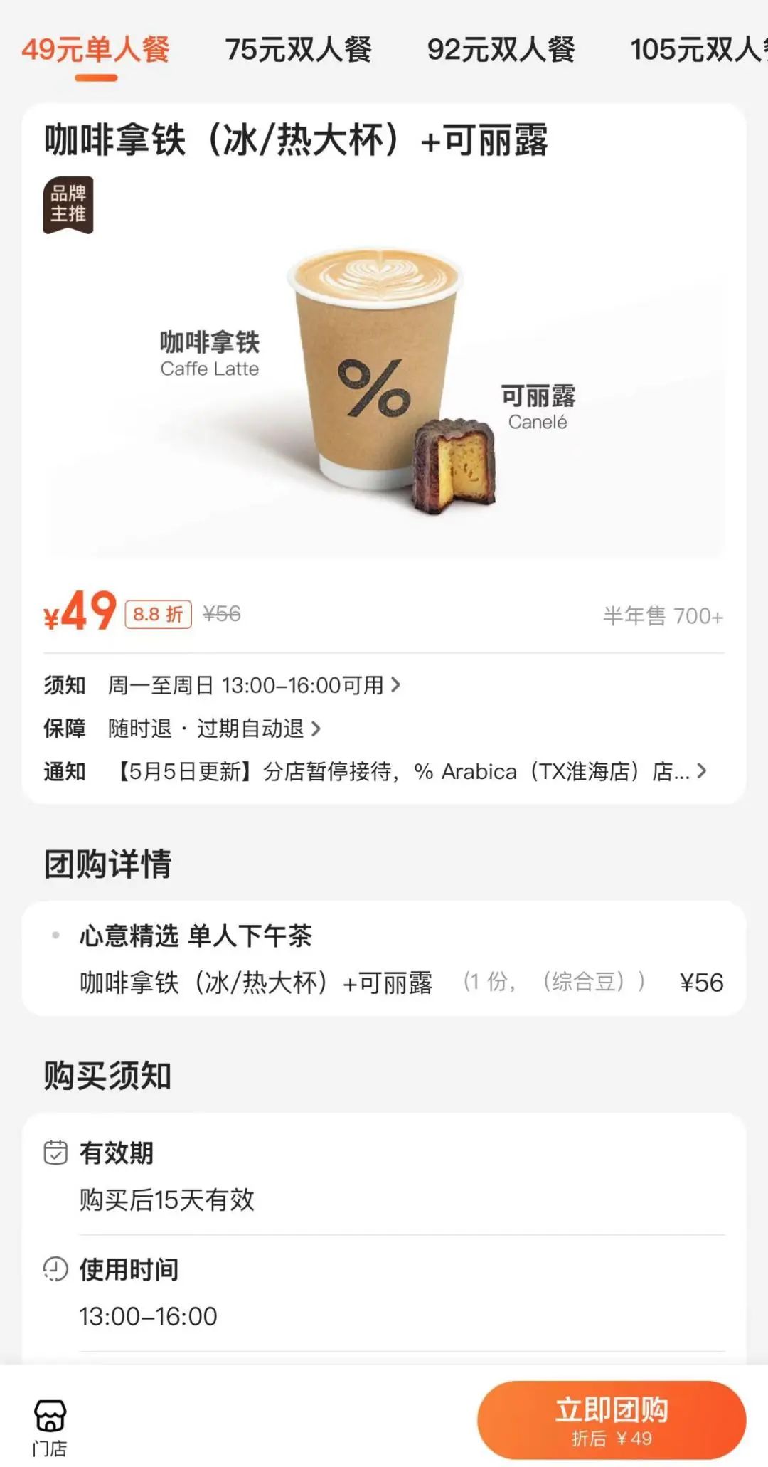 盒飯財(cái)經(jīng)發(fā)現(xiàn),網(wǎng)紅咖啡店%Arabica目前在抖音暫未上架團(tuán)購(gòu)商品,但成為了首批在小紅書上架團(tuán)購(gòu)商品的咖啡品牌商家,其在小紅書上架的團(tuán)購(gòu)套餐包括48元的單人套餐——?jiǎng)偤帽却蟊婞c(diǎn)評(píng)低一元。