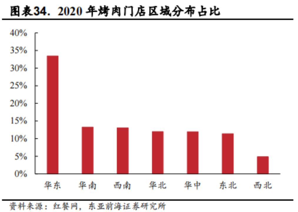 據(jù)紅餐網(wǎng)數(shù)據(jù),烤肉在華東一代的門店占比最高,達(dá)到33.46%。而其他城市的占比基本在10%至15%。