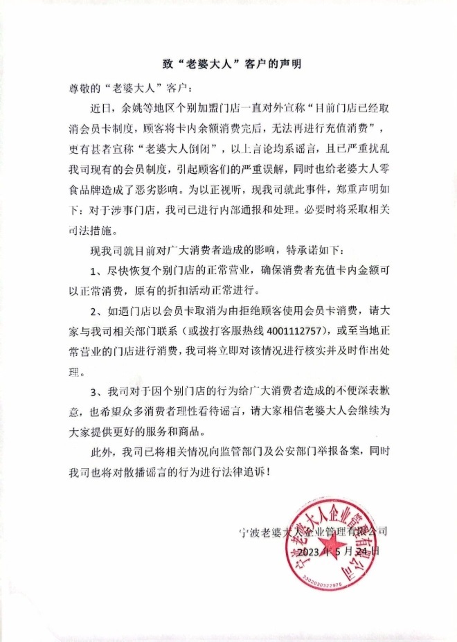 聯(lián)商快訊:5月24日晚,零食品牌“老婆大人”微信公眾號(hào)發(fā)布情況說明稱,此前網(wǎng)傳“取消會(huì)員卡制度”“倒閉”等消息均為謠言。“老婆大人”承諾將盡快恢復(fù)個(gè)別門店的正常營業(yè),確保消費(fèi)者充值卡內(nèi)金額可以正常消費(fèi)。