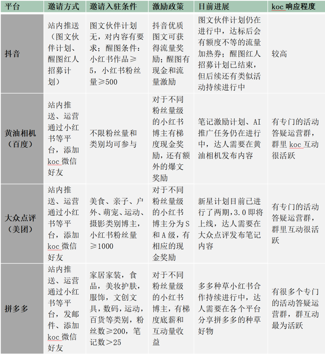 經(jīng)過對比后發(fā)現(xiàn),每個(gè)平臺(tái)在挖角時(shí),一般會(huì)針對KOC的粉絲量級做以激勵(lì)區(qū)分,入駐條件和機(jī)制也有所不同,詳見下表。