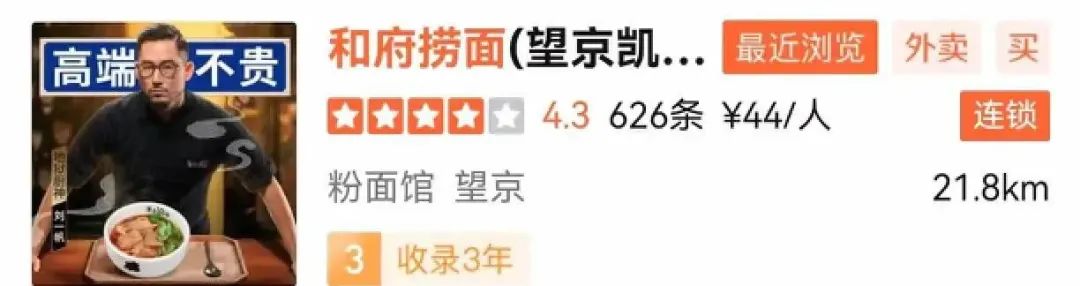如今在大眾點評搜索和府撈面,顯示在左側(cè)的“線上門頭”顯示出一位“廚神”,同時還有4個大字縈繞——高端不貴。