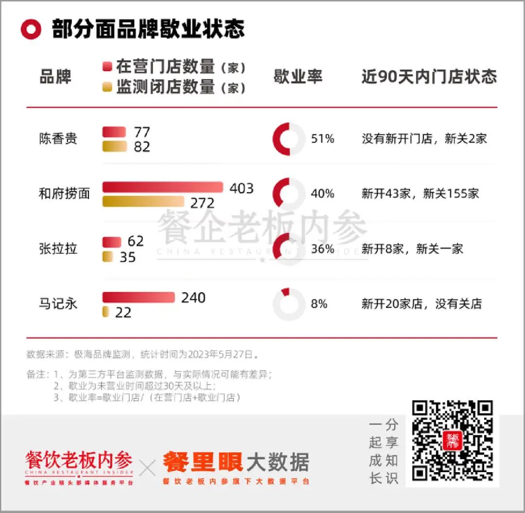 極海品牌監(jiān)測顯示,陳香貴在營門店從2021年11月全國門店達到峰值,共有149家,到2023年5月27日僅剩下77家,歇業(yè)門店82家,歇業(yè)率達到了51%;張拉拉在營門店62家,歇業(yè)門店35家,歇業(yè)率達到了36%;和府撈面則歇業(yè)272家,歇業(yè)率達到40%。幾個面館新貴中,僅今年初獲得騰訊投資的馬記永比較“穩(wěn)”。