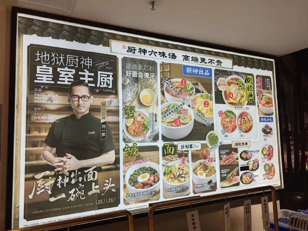 周六中午,內(nèi)參君來到北京和府撈面某商場店,1:30左右,店內(nèi)依舊人頭攢動。遠遠地“膜拜”了廚神的照片之后,走進一看,“廚神六味湯,高端更不貴”的大字赫然眼前,同時,“廚神”推薦了3款面,分別是33元的紅燒牛肉面、35元的花膠雞湯面、35元的草本豬骨湯雪花牛肉面。