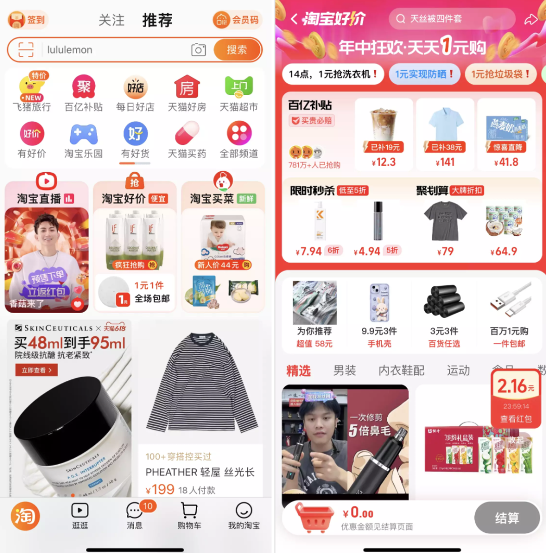 一個月前,手淘悄然內(nèi)測改版,將首頁原本的四大流量入口縮減為三個,位置分別給予了淘寶直播、淘寶買菜和一個新頻道——淘寶好價。