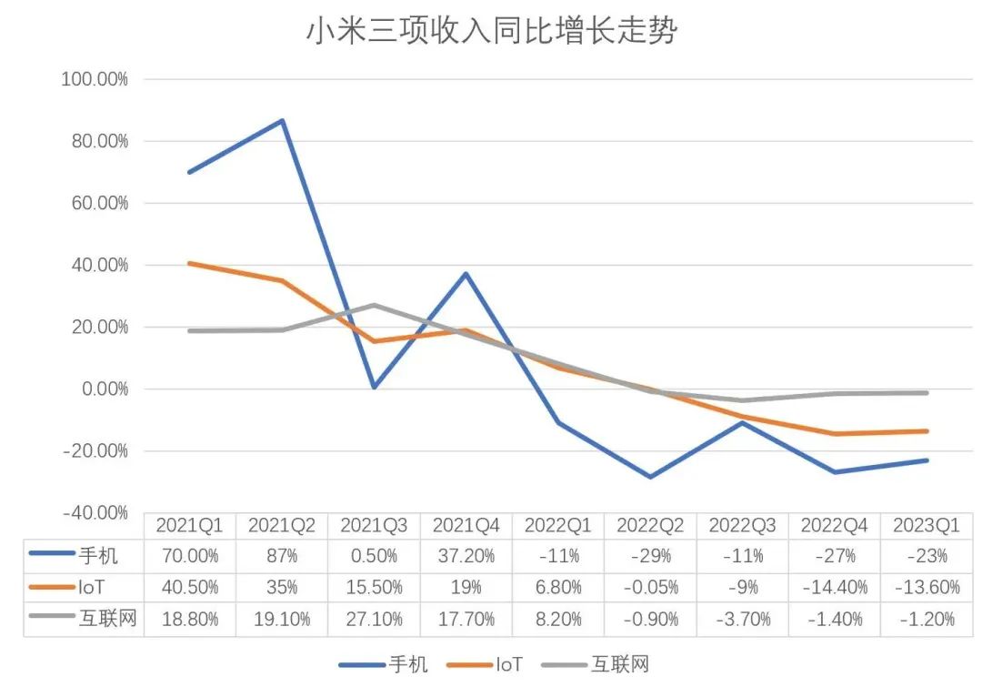 意料之內(nèi),小米營收的三輛馬車速度慢了許多。2023年Q1小米整體的收入是594億元,是最近三年來的最低水平。其中包括手機(jī)業(yè)務(wù)收入350億元,IoT收入168億元,以及互聯(lián)網(wǎng)收入70億元,每一項(xiàng)收入的同比和環(huán)比增長,都出現(xiàn)了不同程度的下滑。