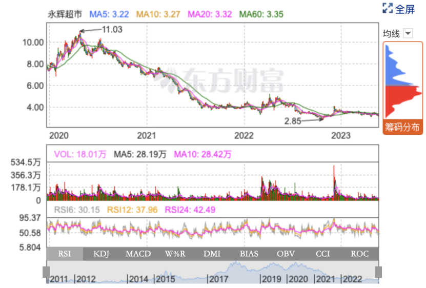 令人好奇的是,作為現(xiàn)有門店數(shù)量破千家的零售超市,二級資本市場也“用腳”投票,永輝超市整體股價從2020年的11元/股的高位一路走低,目前徘徊在3元/股左右的價格。