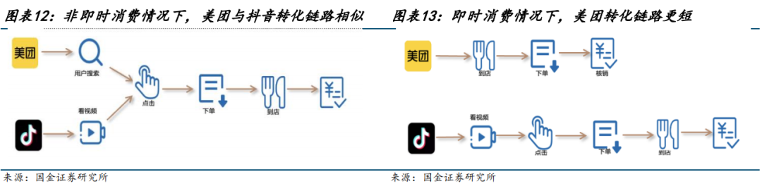 原本在非即時(shí)消費(fèi)場(chǎng)景下,美團(tuán)和抖音的轉(zhuǎn)化鏈路基本一致:“搜索/看視頻-下單-到店-核銷”;但是到了即時(shí)消費(fèi)場(chǎng)景,美團(tuán)的轉(zhuǎn)化鏈路更短,只需要“到店-下單-核銷”即可。抖音則仍需要用戶“看視頻-下單-到店-核銷”。