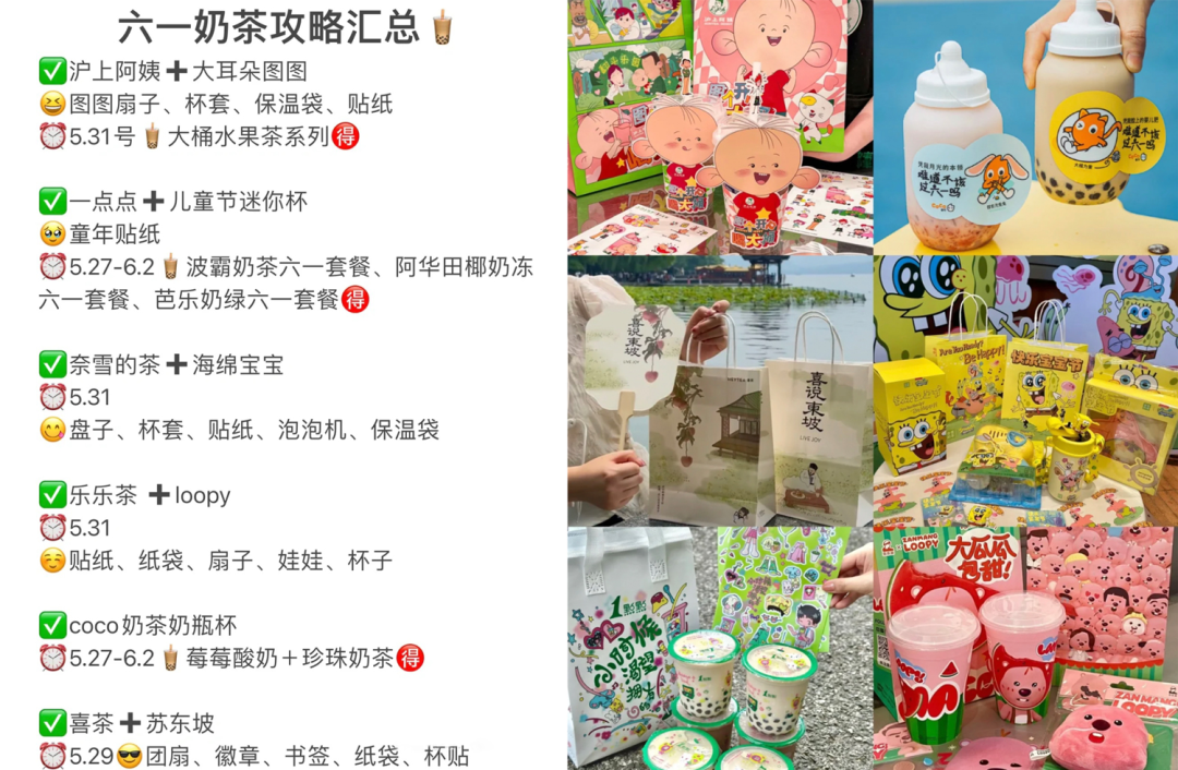 比如下圖就是網(wǎng)友總結(jié)的六一奶茶攻略匯總,各大品牌都上線了兒童節(jié)新品和周邊,從杯套到扇子、玩具、保溫袋、保溫杯、奶瓶杯、泡泡機等,可以說是應(yīng)有盡有。