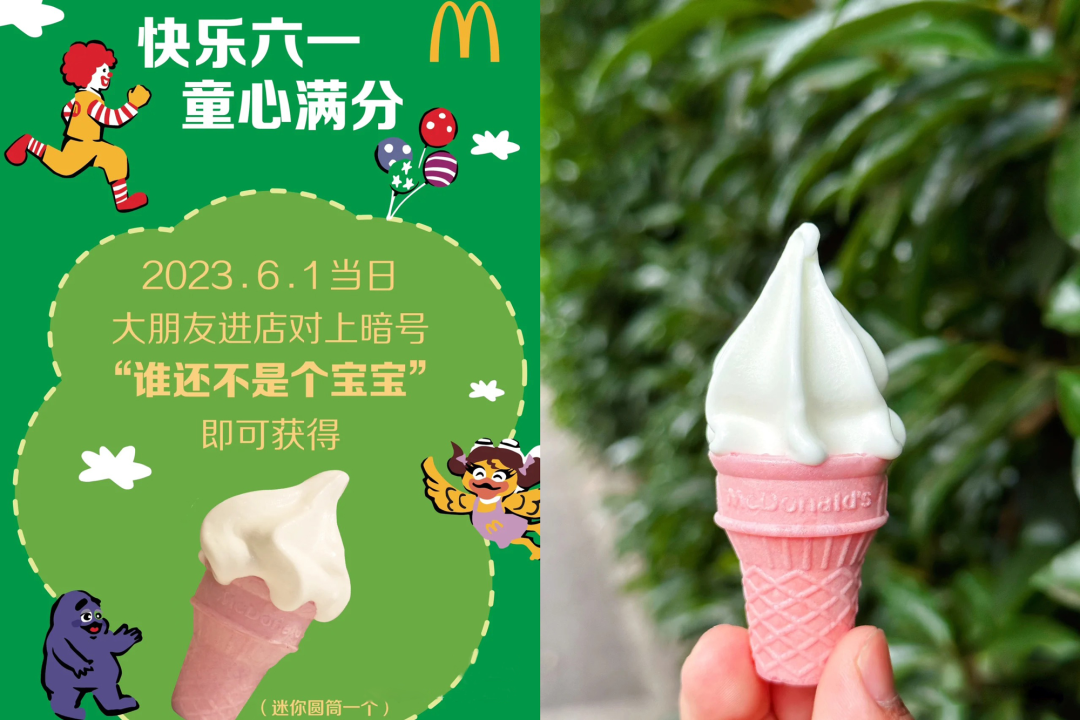 “六一當天,大朋友進麥當勞憑暗號,可以獲得mini冰淇淋一個”;