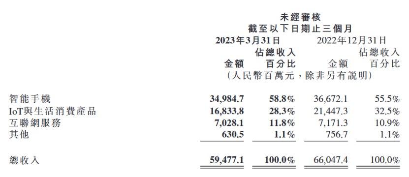 第二大業(yè)務(wù)IoT業(yè)務(wù)營收168億元,同比下滑13.6%。小米IoT業(yè)務(wù)主要包括筆記本、電視等品類。今年一季度,全球個人電腦市場臺式機和筆記本電腦的總出貨量5400萬臺,同比下降了33%。受限于大環(huán)境,本季度小米智能電視及筆記本電腦收入從去年同期的62億元下降到了47億元,同比下滑24.2%。而本季度大家電雖然表現(xiàn)出色,但這類產(chǎn)品的特點是ASP比較高,基數(shù)比較小,很難撐起增長。