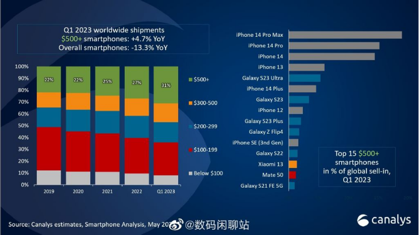 高端轉(zhuǎn)型的必要性在于整體市場持續(xù)低迷的情況下,留給中低端機型走量的空間越來越小,但高端份額卻在逆勢增長。報告顯示,在2023年第一季度全球智能手機出貨量同比下降13.3%的背景下,全球高端智能手機逆勢而上,同比增長4.7%。