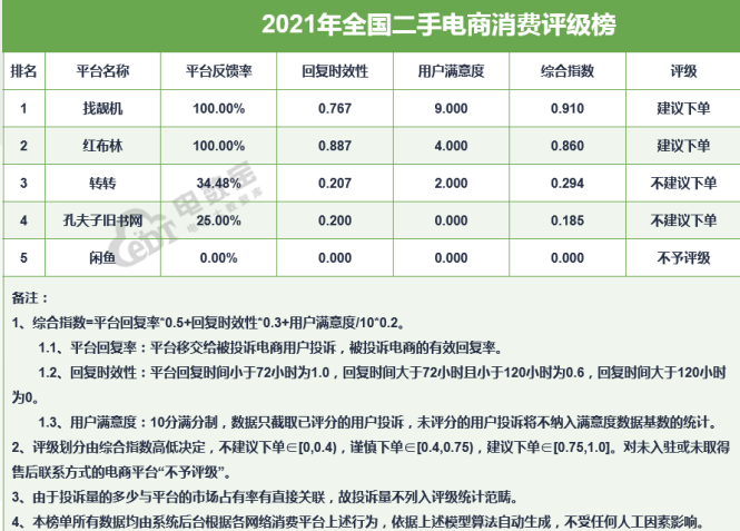 結(jié)合第三方平臺電訴寶發(fā)布的最近兩年全國二手電商消費評價榜來看,該平臺連續(xù)兩年給到閑魚的評級均為“不予評級”,這和找靚機、紅布林連續(xù)兩年收獲“建議下單”的評級形成了巨大的反差。