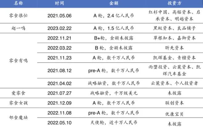 事實(shí)上,近兩年新一代的線下零食連鎖行業(yè),可謂是一片火熱,拿融資拿到手軟。就在今年2月,“趙一鳴零食”拿下了黑蟻資本、良品鋪?zhàn)拥?.5億融資;去年,“零食有鳴”拿到了千萬元級別的Pre-A輪融資;而“零食很忙”則早在2021年就拿下了2.4億元的A輪融資。