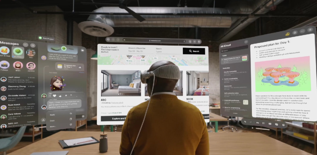 外觀設(shè)計(jì)上,Vision Pro就像一個(gè)滑雪護(hù)目鏡。用戶戴上之后,不僅能看到虛擬世界的頁面,各種APP都呈現(xiàn)在眼前,還能看到現(xiàn)實(shí)世界的事物,只用視線配合手勢或語音就可以進(jìn)行APP控制。