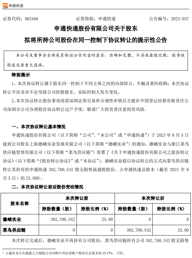 6月6日,申通快遞股份有限公司公告稱,大股東德峨實業(yè)與浙江菜鳥供應(yīng)鏈管理有限公司(菜鳥供應(yīng)鏈)簽署了《關(guān)于申通快遞股份有限公司之股份轉(zhuǎn)讓協(xié)議》,德峨實業(yè)擬以協(xié)議轉(zhuǎn)讓的方式向菜鳥供應(yīng)鏈轉(zhuǎn)讓其持有的申通快遞25%股份。