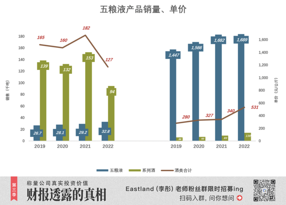 2022年系列酒銷量下降30%,但單價提高57%至130元/公斤。五糧液酒銷售均價為1689元/公斤、同比增幅僅0.4%。