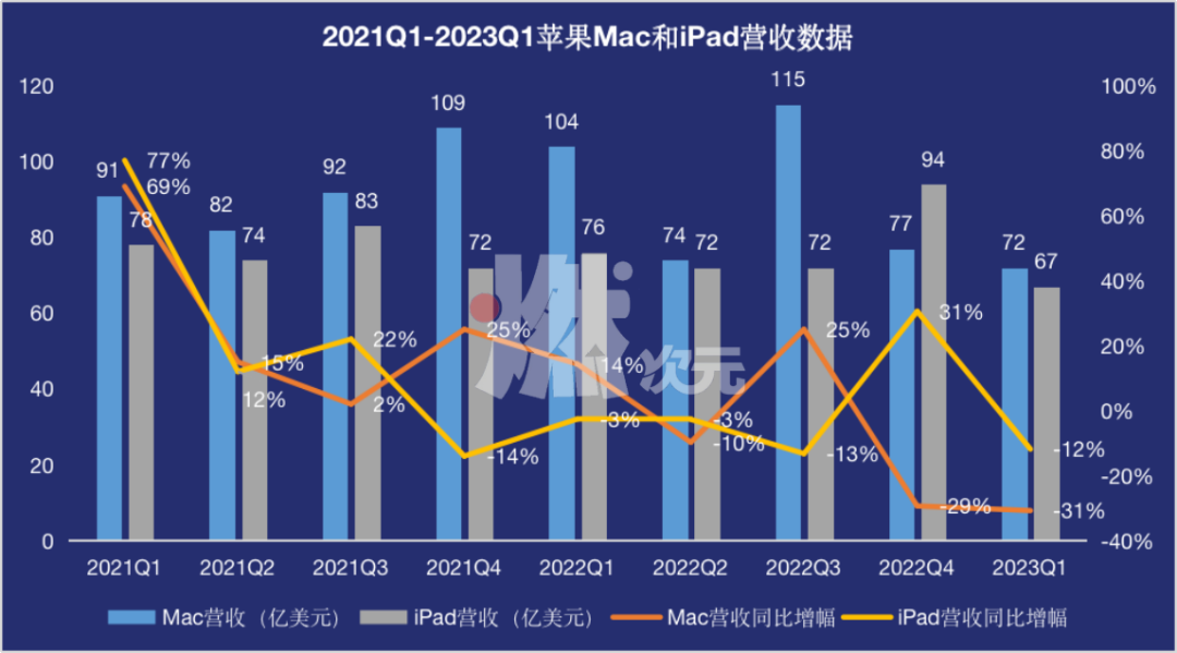 2023年第一季度,蘋果Mac和Ipad營(yíng)收分別為72億美元和67億美元,分別同比下跌31%和13%。兩位“青銅隊(duì)友”大幅度的同比下降抵消了iPhone這位“王者”的逆勢(shì)增長(zhǎng)。