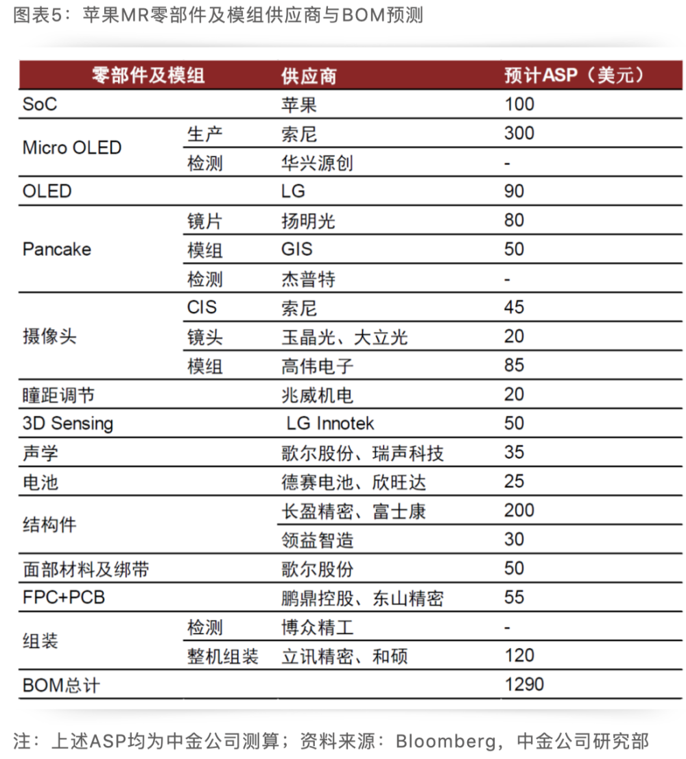中金報(bào)告對(duì)蘋果MR的零部件及模組供應(yīng)商與BOM(物料清單)的報(bào)價(jià)進(jìn)行了估算,總價(jià)為1290美元,光是索尼一塊Micro-OLED屏幕就報(bào)價(jià)300美元。要知道,Meta最新發(fā)布的Quest3起售價(jià)也不過499美元。
