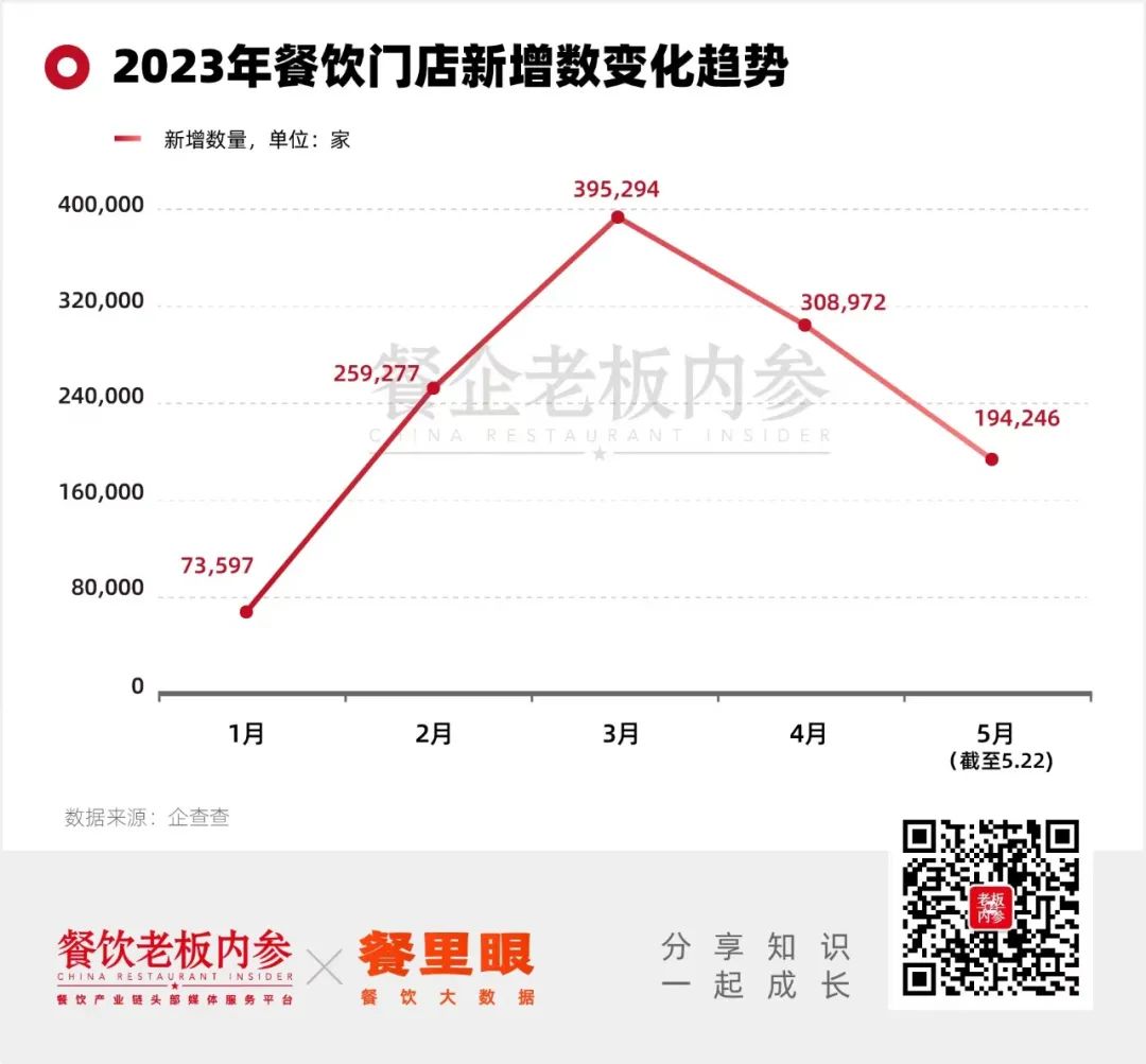 根據(jù)企查查數(shù)據(jù)顯示,2023年1月1日-5月22日,全國(guó)餐飲新增123.13萬(wàn)家。其中1月份新增73597家;2月份開始進(jìn)入“狂飆”,新增259277家;3月份新增395294家;4月份開始回落,但也有308972家;5月份統(tǒng)計(jì)了22天,新增194246家。