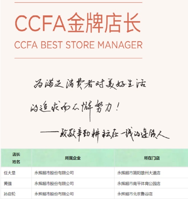“CCFA金牌店長”名單公示,永輝超市三店上榜