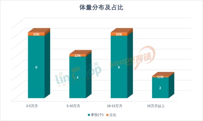 新開(kāi)商業(yè)項(xiàng)目中,規(guī)模在2至5萬(wàn)方(含2萬(wàn)方,不含5萬(wàn)方)數(shù)量和規(guī)模10至15萬(wàn)方(含10萬(wàn)方,不含15萬(wàn)方)數(shù)量最多,各占比33%;5至10萬(wàn)方(含5萬(wàn)方,不含10萬(wàn)方)占比約22%;15萬(wàn)方以上(含15萬(wàn)方)占比約11%。