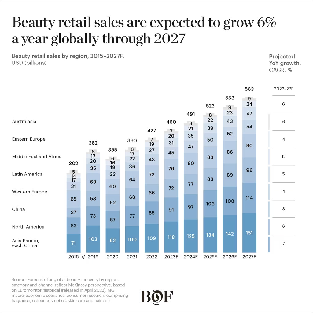 業(yè)內(nèi)預(yù)測(cè)中國(guó)美容市場(chǎng)零售額在2027年達(dá)到960億美元,將占全球銷售額的1/6。但市場(chǎng)復(fù)合年增長(zhǎng)率預(yù)計(jì)將下滑至8%左右,這一數(shù)字在2015-2019年是12%。中東、印度和北美將成美妝的新增長(zhǎng)極。