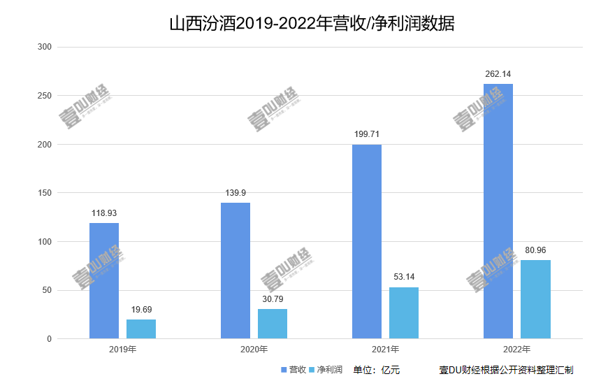 事實(shí)上,山西汾酒近年來業(yè)績(jī)?cè)鏊僖恢北容^穩(wěn)定。其財(cái)報(bào)數(shù)據(jù)顯示,2019年至2022年,山西汾酒的營(yíng)收分別為118.93億元、139.90億元、199.71億元和262.14億元,凈利潤(rùn)分別為19.69億元、30.79億元、53.14億元和80.96億元。