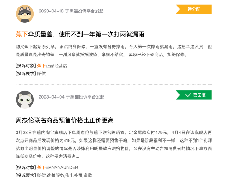 在黑貓投訴平臺有關(guān)蕉下的616條投訴里,消費者反映的問題包括但不限于:產(chǎn)品質(zhì)量差、不同平臺存在差價、部分商品預(yù)售價比正價高等。