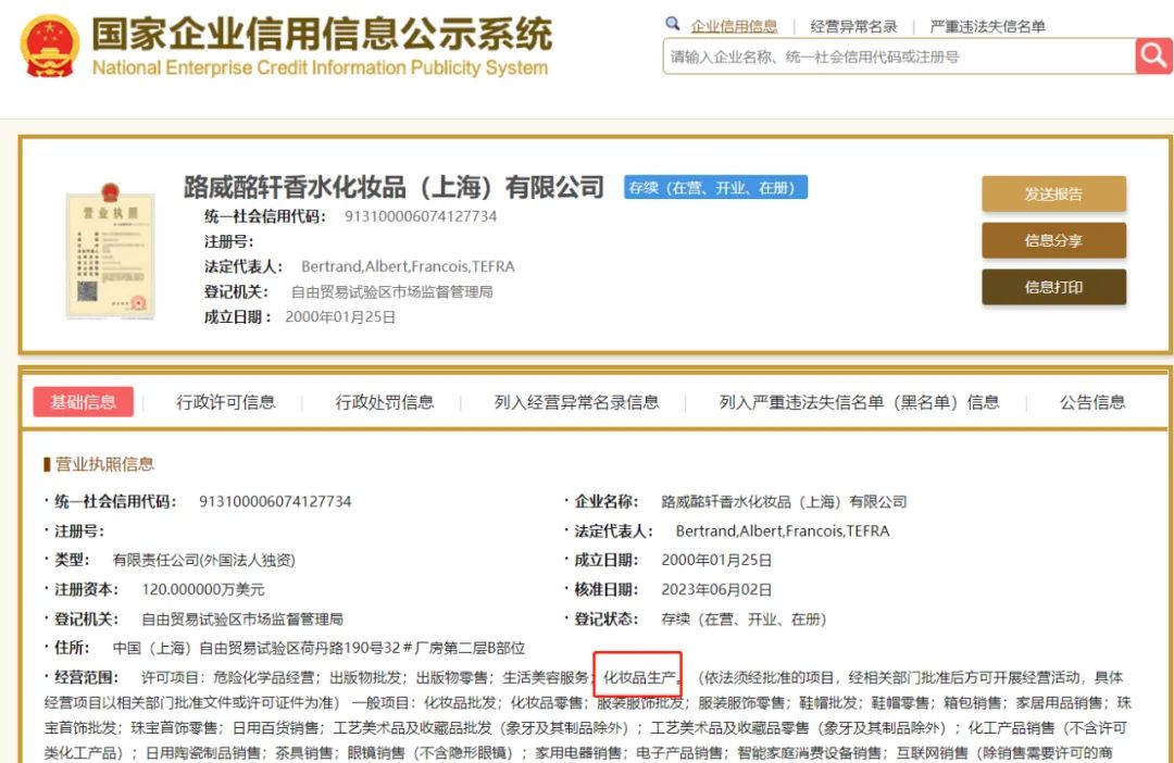 國家企業(yè)信用信息公示系統(tǒng)顯示,路威酩軒香水化妝品 (上海)有限公司成立于2000年1月,是一家外國法人獨資企業(yè),注冊資本120萬美元(折合人民幣約856.28萬元),目前經(jīng)營范圍為生活美容服務(wù)、化妝品生產(chǎn)、化妝品批發(fā)和化妝品零售等。相較此前的經(jīng)營范圍,本次新增許可項目多了“化妝品生產(chǎn)” 。