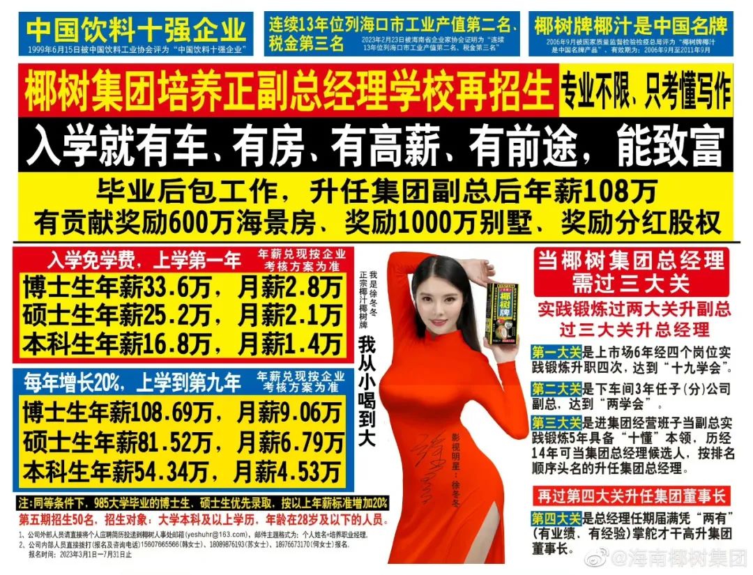2022年1月29日,椰樹集團(tuán)在開門紅報(bào)喜中提到 : 2019年“我從小喝到大”椰樹牌椰汁廣告風(fēng)波和2021年“椰樹”培養(yǎng)職業(yè)經(jīng)理學(xué)員招生廣告風(fēng)波時(shí)應(yīng)對(duì)決策成功,合計(jì)引起5億多人次網(wǎng)民關(guān)注,再次提升“椰樹”品牌知名度,促進(jìn)銷量持續(xù)逆勢(shì)增長(zhǎng)。