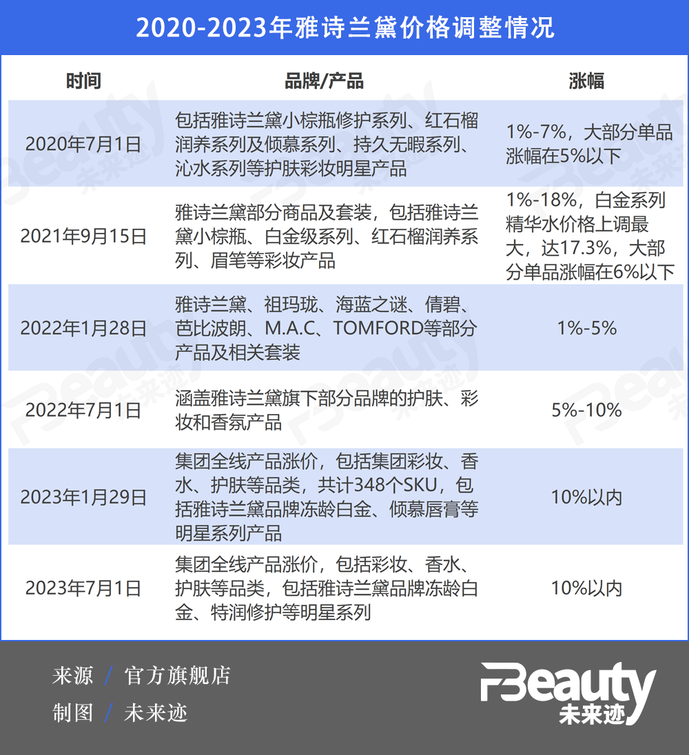 《FBeauty未來跡》不完全梳理發(fā)現(xiàn),自2020年開始,雅詩蘭黛便開始不斷上調價格,迄今為止至少有6次調整。