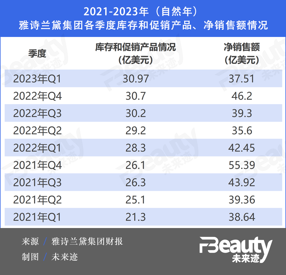 從公開財報來看,從2021年到2023年,雅詩蘭黛的庫存和促銷產品占凈銷售額的比例在慢慢走高,由2021年第一季度的五成左右,漲至2023年一季度的八成以上。
