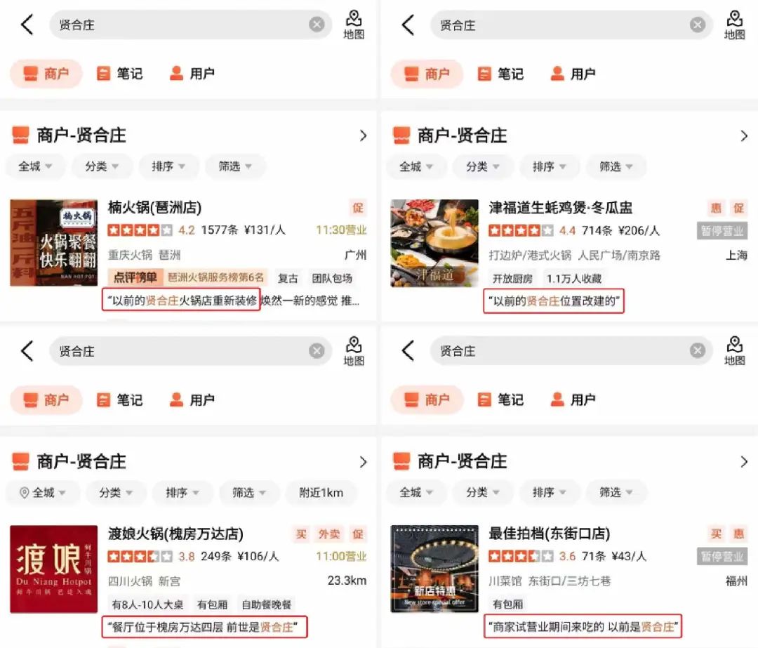 其余地區(qū)也均是類似情況,甚至出現(xiàn)“我的前世,是賢合莊”這種前世姻緣的搞笑故事。多位網(wǎng)友在撰寫種草餐廳文案時寫到,“餐廳位于xxx,前世是賢合莊”。