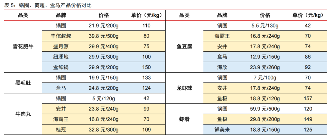 總體來看,鍋圈所處的火鍋食材賽道并非是高門檻行業(yè),商業(yè)模式極易被復(fù)制,也很容易被其他渠道替代,缺乏強(qiáng)大的護(hù)城河。以商品價(jià)格為例,與盒馬相比,鍋圈的大多數(shù)商品價(jià)格并不親民。如雪花肥牛,從單價(jià)來算,鍋圈價(jià)格要比盒馬貴10塊錢。