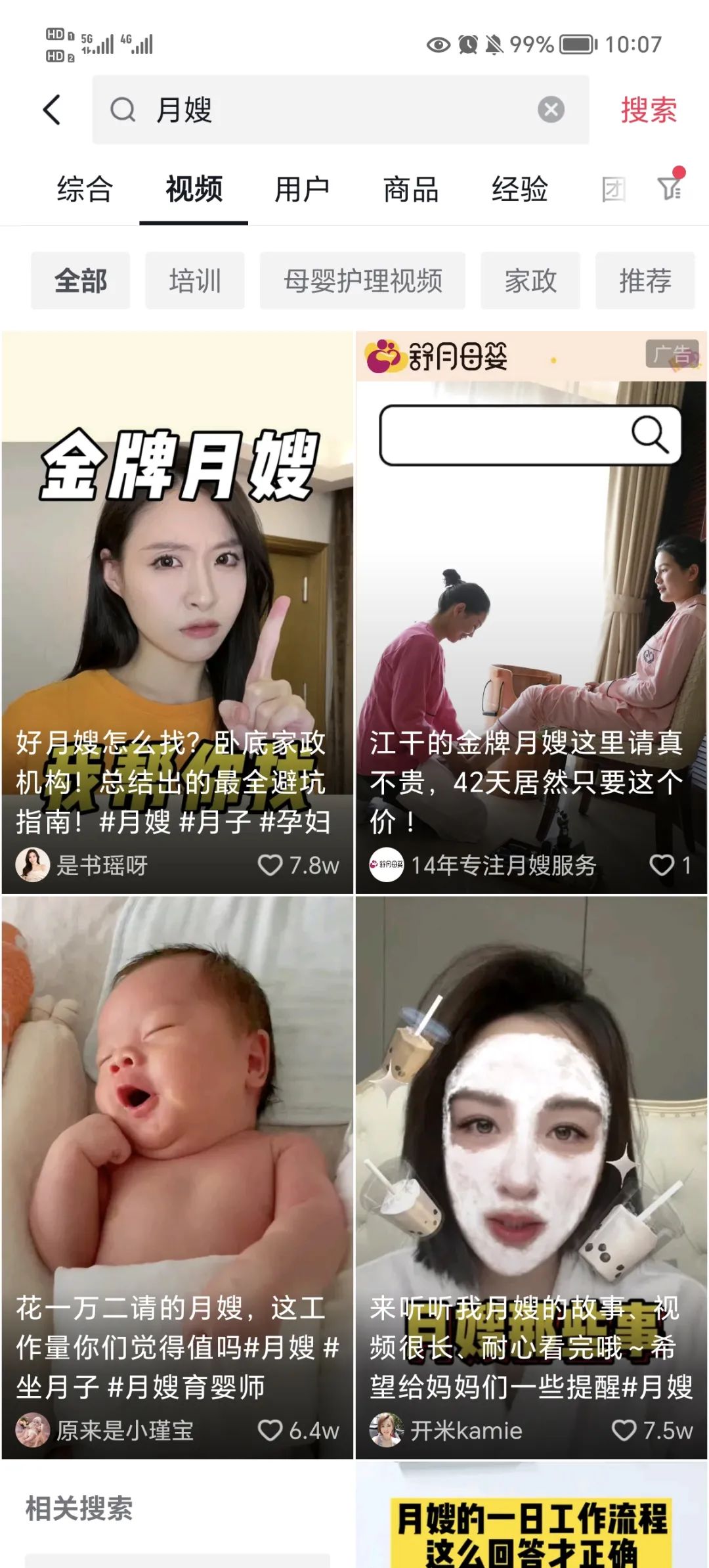 例如,在抖音上搜索“月嫂”,會(huì)出現(xiàn)不少育嬰師、月嫂的個(gè)人賬號(hào),其中不乏粉絲數(shù)超過50萬的賬號(hào)。另外,還會(huì)出現(xiàn)一些家政公司或家政培訓(xùn)機(jī)構(gòu)的官方賬號(hào)。