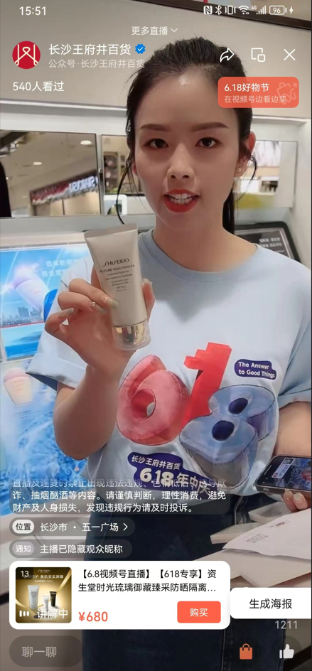 本次618消費季活動期間,集團提前與微信視頻號官方取得活動資源,根據(jù)全國各業(yè)態(tài)門店實際情況,組織重點門店參與618視頻號直播大促活動,并配備直播扣點減免和流量券等激勵方式。集團還為活動門店提供視頻號官方流量支持、618活動廣告位資源,同時,賦能門店直播能力,力保直播GMV產(chǎn)出。